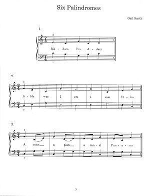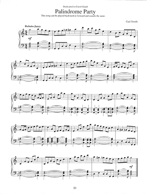 A musical palindrome is a piece which sounds the same when played forwards and backwards, in the same way that the words "mom" and "dad" read the same forwards and backwards. The brain and the fingers are both exercised when playing a piece backwards on the piano. Reading the notes backwards forces you to think differently and pay more attention. The palindromes in this book range from very easy to difficult. A special exercise uses 120 ways to arrange the five notes C-D-E-F-G (C-D-E-F-G, F-G-E-D-C, D-C-E-F-G, etc.). Practicing these pieces regularly can make you a better sight reader while increasing your dexterity.