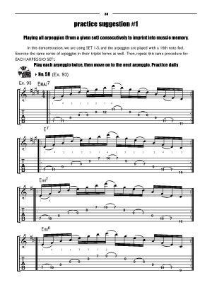 A modern arpeggio handbook and comprehensive training manual for developing fast, flowing arpeggio runs that connect the entire fretboard. Emphasis is on developing fluid, non-shifting arpeggio patterns (across the neck) using hammer-ons and pull-offs for speed and fluidity; and also on developing smooth position-shifting arpeggios (along the length of the neck) using slides. These two types of motion are then connected and combined in an extensive collection of soloing etudes for full assimilation. The result is a complete system of arpeggio pathways that connects every part of the fretboard and facilitates maximum speed, fluidity, and range. Complete whole-neck connections are presented for major 7th, dominant 7th, minor 7th, minor 6th, half-diminished, diminished 7th, major triadic and minor triadic arpeggios.