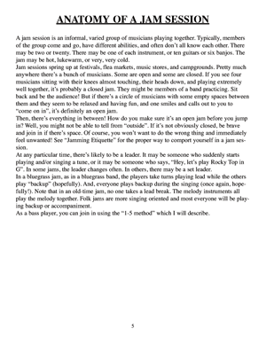 This book presents everything a beginning or intermediate bass player needs to know to participate in a jam session. There are sections that describe the anatomy of a jam session, jam session etiquette and chords and keys for jamming. A play-along online audio is included with 9 typical bluegrass jam tunes. The tunes are played twice: once with the tune played on the left channel and a verbal description on the right channel and once in stereo. Joining a jam session can be intimidating. This book presents everything a beginning or intermediate upright or electric bass player needs to know to participate in a jam session. There are sections that describe how jam sessions work, and jam session etiquette. The book also describes the typical chords and keys for jamming and describes typical bluegrass rhythm. A section is included on the role each instrument plays in bluegrass rhythm. Includes access to online audio.