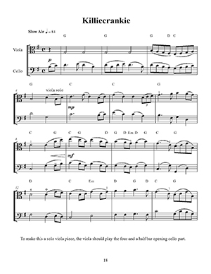 The twenty-five pieces in this collection date back to 18th and 19th century Scotland. Included are song and fiddle airs, strathspeys, reels, jigs, a hornpipe and the sword dance. The pieces are arranged for viola and cello with guitar chords. Since the viola generally has the melody, the pieces can also be played by solo viola. The music of Scotland is unique. The airs have their own special beauty, and the dances are fun to play with lively tempos, dotted rhythms, and sudden key changes. This music has been the pleasure of country fiddlers and pipers. Now violists and cellists, and their listeners, can feel themselves transported to the Lowlands and Highlands of Scotland.