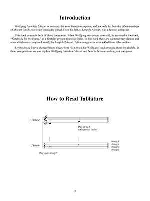 While many are familiar with the music of Wolfgang Amadeus Mozart, fewer are aware that his father, Leopold Mozart, was a famous composer in his own right. At the age of seven, Wolfgang received a notebook from his father as a birthday gift. The "Notebook for Wolfgang" includes contemporary dances and arias, mostly by Leopold Mozart. These compositions provide a glimpse into the formative years of Wolfgang Amadeus Mozart. This book includes fifteen pieces from thenotebook arranged for the ukulele. The melody and bass parts are arranged so the original notation and polyphony are maintained. Each chapter includes pieces presented in standard notation and tablature.