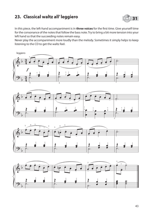 From the basics of music notation, the correct playing position and simple pieces covering a fifth, to mastery of the complete octave and a refined playing technique: This book covers everything the beginning pianist should know. To prevent piano playing from ever becoming boring, it covers a wide range of musical styles from Classical music to Jazz. Other topics include music theory and the acoustic basics of piano tone, thus laying a solid foundation for future studies in piano playing. The included CD makes practicing easy and fun!