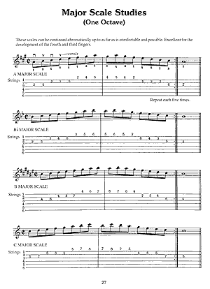 Although this book begins with short exercises using extremely simple, two-finger left-hand movements, it quickly takes these building blocks and stacks them into a skyscraper of precise right- and left-hand technique. Develops left-hand dexterity, solid rhythmic sense, and plectrum technique, including crosspicking, through challenging scale and arpeggio exercises. Standard notation and tablature.