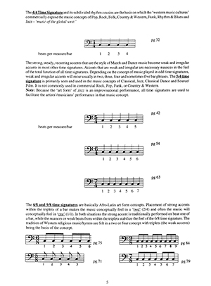 This study examines time signatures and rhythms for the acoustic bass and the four and five-string electric bass. This method book is divided into two sections: 1) addresses simple meters, and 2) focuses on compound meters. This study will promote facility in executing the feel or groove of the rhythm within each time signature. In standard notation only.
