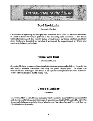 Emphasis is placed on creating and preserving the flow of a piece, sensitivity to accenting, and avoiding any 'jarring' elements, while at the same time following the author's Three-second rule (a guitarist must do something interesting every 3 seconds of a solo to sustain the listener's interest.) Each tune contains brief performance notes and, in some cases, lyrics. To aid in the performance of these songs, this book has a Low-C Chord Chart. The pieces included have very diverse origins, yet they have two common elements - they were not originally composed for the guitar and they are certain to be treasured!